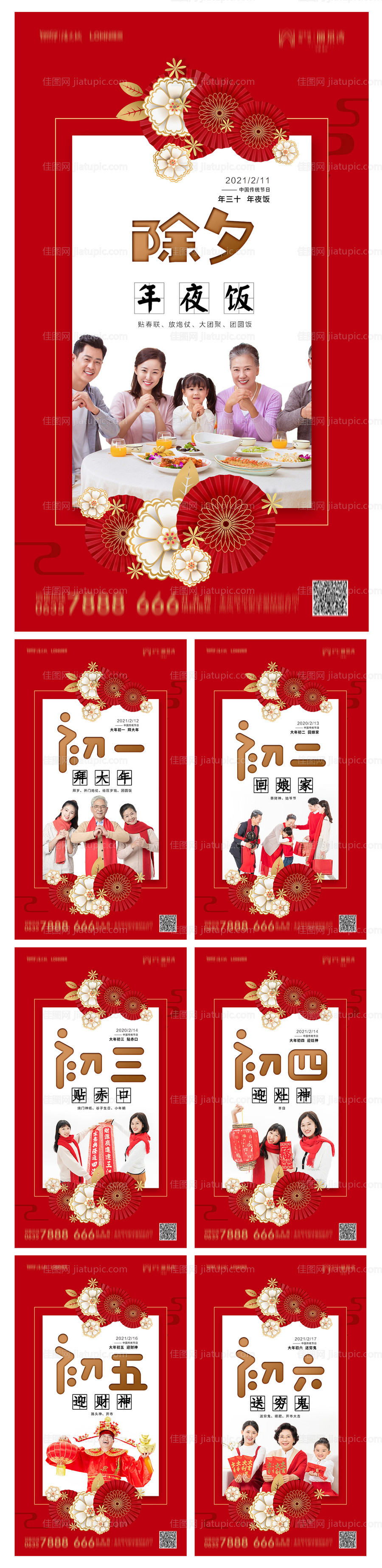 新年除夕初一到初八手绘系列年俗海报-源文件